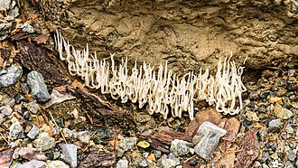 English: Val Sinestra. Candlestick fungus (Xylaria hypoxylon) on an erosion field