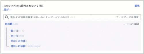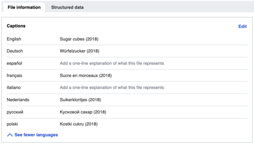 Under the Structured data tab, you can indicate what is portrayed ("depicted") in the file. In this case: twelve white sugar cubes. The screenshot below is animated, demonstrating how the descriptive elements are multilingual. You can see structured data in a different language by switching your interface language setting.